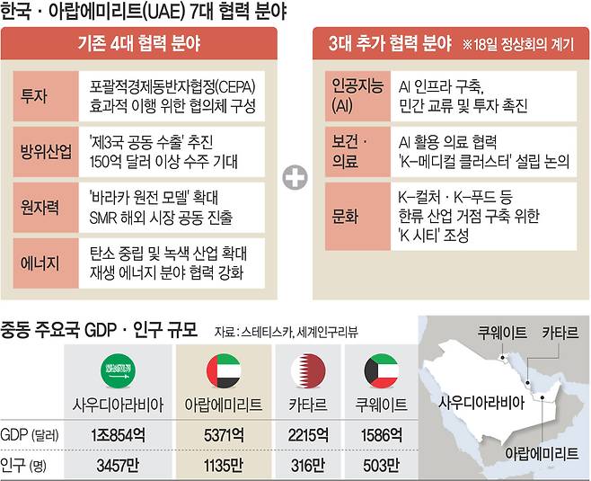 정부는 '100년 동행'을 캐치프레이즈로 내걸고 중동 국가의 수요가 특히 높은 방위산업·인공지능(AI)·원자력 등 7대 핵심 분야 협력을 강화해 경제 영토를 확장할 방침이다.
