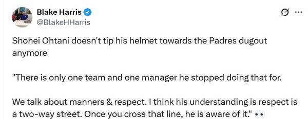 오타니는 보통 다른 팀에 대해 공개적으로 발언하는 데 매우 조심스러운 편이다. 따라서 사구를 맞은 뒤 샌디에이고 더그아웃을 향한 인사를 중단하기로 한 결정은 그가 보낼 수 있는 가장 강한 메시지 중 하나라고 할 수 있다.
