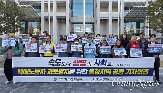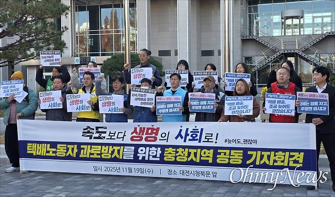 19일 오전, 대전시청 북문 앞이 '속도보다 생명'을 외치는 구호로 가득 찼다. 택배노조충청지부와 민주노총대전본부, 서비스연맹대전세종충청본부, 대전연대회의, 대전민중의힘, 진보당·정의당·사회민주당·노동당·녹색당 대전시당 등 지역 노동·시민사회단체가 공동으로 '택배노동자 과로방지와 심야배송 규제'를 촉구하는 기자회견을 열었다.