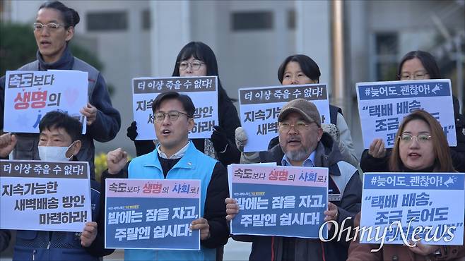 이들은 "쿠팡을 비롯한 대형 택배기업들이 '로켓배송', '365일 배송'이라는 이름으로 택배노동자들을 심야노동의 굴레 속에 내몰고 있다"며 "죽음의 새벽배송을 멈추고 건강권과 휴식권이 보장되는 사회로 나아가야 한다"고 촉구했다.