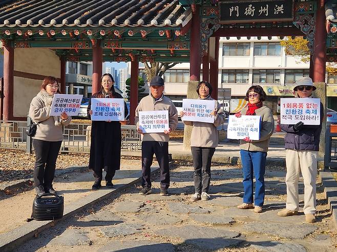 | ▲ 19일 충남 예산홍성환경운동연합 활동가들과 회원들이 홍성 군청 앞에서 기자회견을 열고 '지역 축제에서 발생하는 쓰레기량을 줄여야 한다"고 촉구했다. |