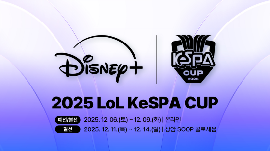 한국e스포츠협회(이하 협회)는 디즈니+가 단독 중계하는 국내 유일의 리그 오브 레전드(이하 LoL) 단기 컵대회 '2025 LoL KeSPA CUP'이 오는 12월 6일(토) 개막한다고 19일(수) 밝혔다.