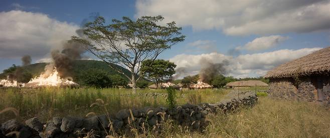 그렇다면 남는 쟁점은 어떻게 구체적이고 뚜렷하게 폭력의 실체를 형상화하느냐 여부로 넘어간다. 텍스트로 4.3을 이해하더라도 시각 이미지로 재연되는 장면을 소화하는 건 별개 문제다. 영화는 현실판 지옥도를 묘사하지만, 선정적으로 다루는 우를 범하지 않는다. 그래도 두 눈 질끈 감거나 고개를 돌려 외면하고 싶다면 어쩔 수 없지만, 현실이 몇 곱절 더 끔찍했다는 건 감안해야 한다. 민간인 학살, 군경의 수탈과 고문이 숱하게 나오지만 직접적 표현은 가능한 절제된다. 그래도 상상만으로 경악하는 건 어쩔 수 없다. 실제가 그랬으니까.