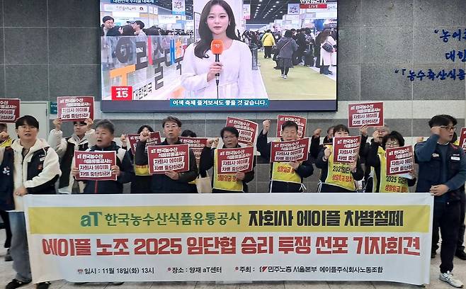 민주노총 서울본부 직가입노조인 에이플주식회사 노동조합(이하 에이플노조)이 18일 오후 양재 aT센터에서 기자회견을 열고, 2025년 임금·단체협약(임단협) 승리를 위한 투쟁 돌입을 선언했다.