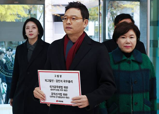 19일 서울경찰청 민원실에 고발장을 제출한 후 먼저 마이크 앞에 선 것은 박정훈 국민의힘 의원이었다. 박 의원은 "저희는 오늘 김민석 국무총리를 선거법 위반 그리고 공무원의 정치적 중립을 규정한 국가공무원법 위반 혐의로 고발하러 이 자리에 왔다"라며 "김민석 국무총리는 여러분들 아시는 것처럼 지금 민주당의 유력한 서울시장 후보"라고 강조했다.