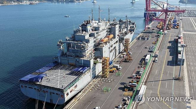 (창원=연합뉴스) 김동민 기자 = 19일 오후 경남 창원시 마산합포구 마산가포신항에서 미 해군 군수지원함 '월리 쉬라 호'의 MRO 작업이 진행 중이다.