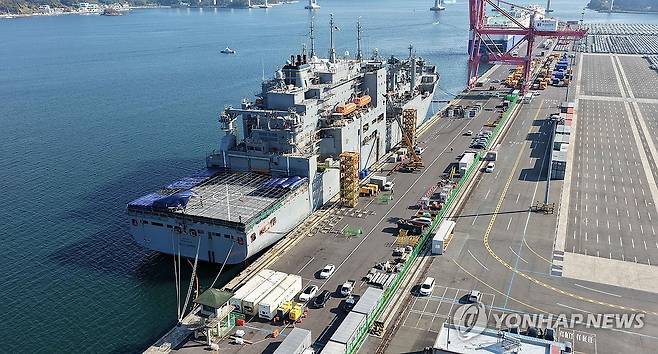 (창원=연합뉴스) 김동민 기자 = 19일 오후 경남 창원시 마산합포구 마산가포신항에서 미 해군 군수지원함 '월리 쉬라 호'의 MRO 작업이 진행 중이다.
