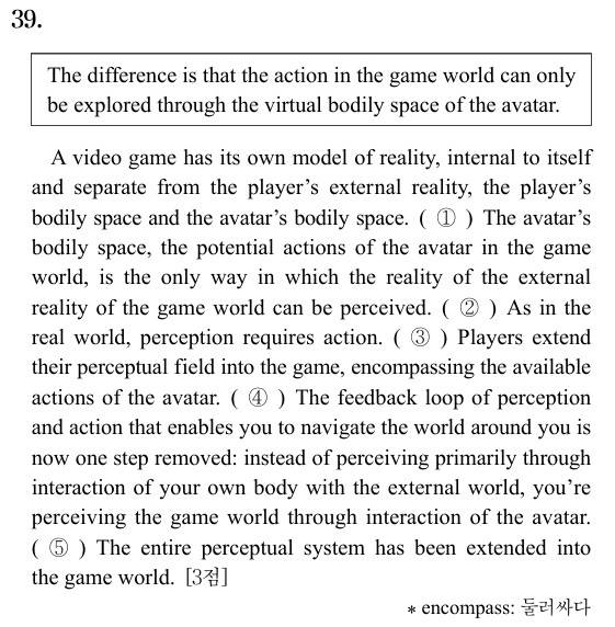 "( ① ) 앞 문장이 "게임에는 자체적 현실 모델이 있고, 플레이어의 외적 현실·플레이어의 신체 공간·아바타의 신체 공간과 구분된다"라고 기술하였으므로 바로 뒤에 "차이점은 게임 세계의 행동을 탐색하는 방식이 아바타의 신체 공간을 통해서만 가능하다"라는 문장이 와야 자연스럽다. 주어진 문장 'The difference is that…'가 "현실 세계에서와 마찬가지로 지각에는 행동이 필요하다"라는 ( ② ) 뒤의 문장 다음에 나오게 되면(즉, 정답이 3번이라면) 'The difference'가 무엇과 무엇의 차이를 말하는지 불분명해져 문맥이 단절된다."