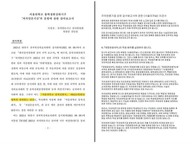 | ▲ 서울대학교 총학생회산하기구 '자치언론기금'의 운영에 관한 감사보고서(좌), 자치언론기금 운영 감사보고서에 관한 <서울대저널> 의견서(우) |