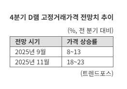 메모리 업체들이 핵심 생산 라인을 AI 서버에 탑재되는 고대역폭메모리(HBM)에 배정하면서 범용 D램 공급 부족이 심화되고 있다. 인공지능(AI) 급성장에 힘입어 기록적 강세기에 진입한 메모리 시장은 공급자 우위로 전환된 지 오래다. 시장조사기관 트렌드포스에 따르면 올해 3·4분기 D램 고정거래가격은 전년 동기 대비 171.8%나 상승했다.