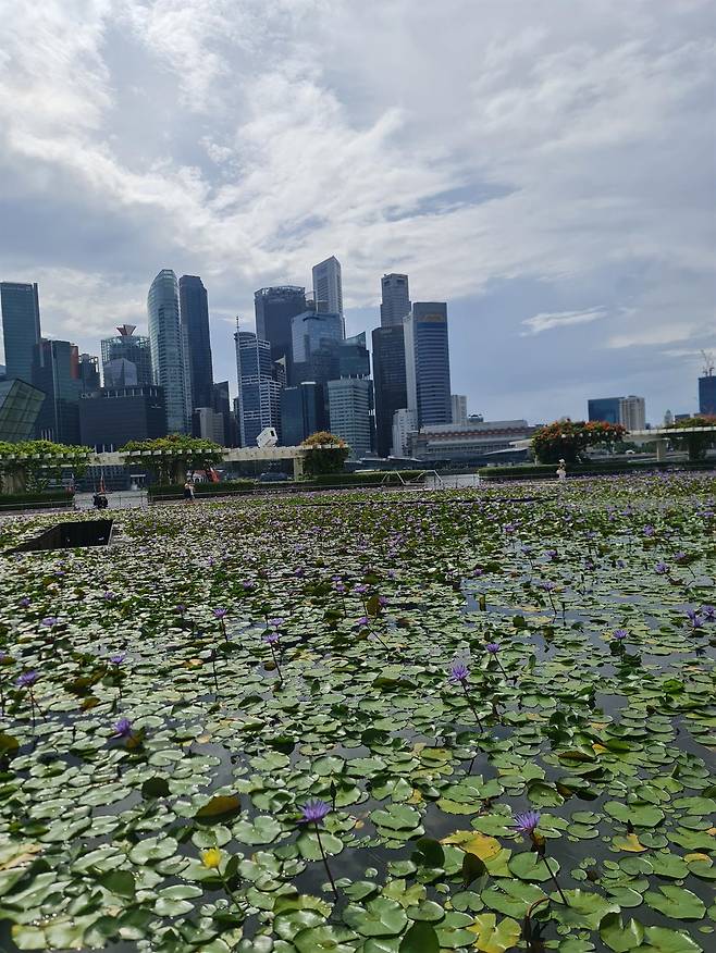 | ▲ 싱가포르 아트사이언스관 앞 수련 도시의 압도적인 스카이라인과 자연이 한 프레임 안에서 충돌하지 않고 공존하는 풍경은, 싱가포르가 왜 ‘정원 속의 도시’라 불리는지를 보여준다. |