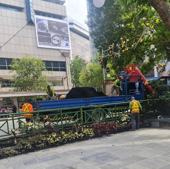 | ▲ 싱가포르 오차드거리 가로수 유지 관리작업 싱가포르 도심에서는 도로변 가로수를 손질하고 비료를 주는 장면을 어렵지 않게 볼 수 있다. 도시의 초록을 '장식'이 아닌 관리해야 할 도시 자산으로 규정하는 싱가포르의 도시에 대한 생각을 그대로 보여주는 풍경이다. |