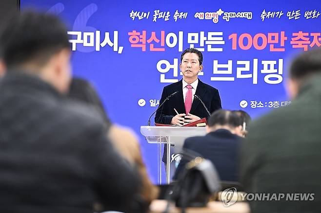 (구미=연합뉴스) 경북 구미시 김장호 시장이 19일 시청에서 열린 올해 지역축제 언론브리핑에서 발언하고 있다. 2025.11.19 [구미시 제공. 재판매 및 DB 금지]
