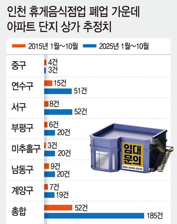 10년 동안 인천 전체 휴게음식점업 폐업이 151.7% 증가할 동안 아파트 상가에선 255.8% 불어났다. 특히 신축 아파트가 집중되는 연수구와 서구에서 관련 숫자가 눈덩이처럼 불어나고 있다. 2015년 연수구와 서구 각각 15건, 8건이던 게 올해 51건, 52건에 달한다.