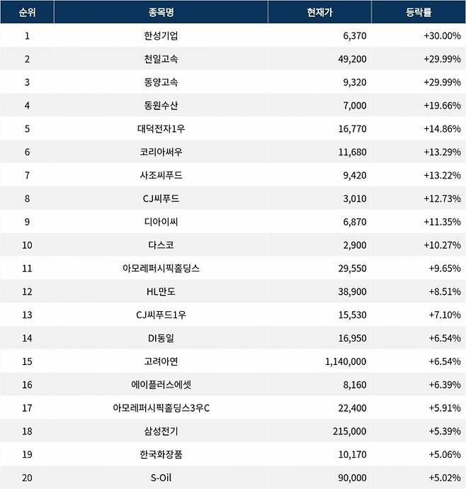 이어 상승률 2위 천일고속(000650)은 주가가 +29.99%로 종가 49,200원에 상승 마감했다. 상승률 3위 동양고속(084670)의 주가는 9,320원으로 +29.99% 상승하며 두각을 나타냈다. 상승률 4위 동원수산(030720)은 +19.66% 상승하며 7,000원에 마감했다. 상승률 5위 대덕전자1우(35320K)는 +14.86%의 상승세를 타고 종가 16,770원에 마감했다.