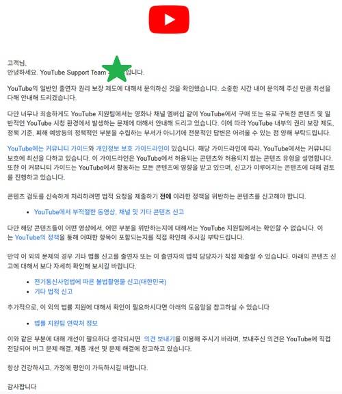 | ▲ 유튜브 코리아에서 회신한 가이드라인·신고 절차 |