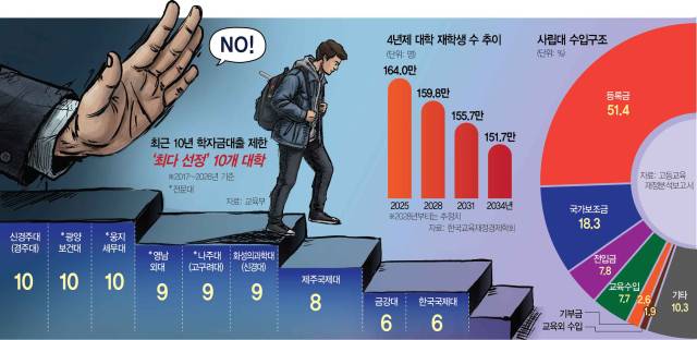 19일 서울경제신문 취재를 종합하면 국내 대학 10개 중 1~2개 꼴로 최근 10년 사이 재정 건전성 측면에서 하위 평가를 받은 경험이 있는 것으로 나타났다. 대학알리미 공시 기준 국내 대학은 현재 총 415개(일반대 250개·전문대 165개)다. 이 가운데 최근 10년 사이 학자금 대출지원 제한대학으로 1번 이상 선정된 곳은 총 60개교(14.5%, 일반대 31개·전문대 29개)에 달했다.