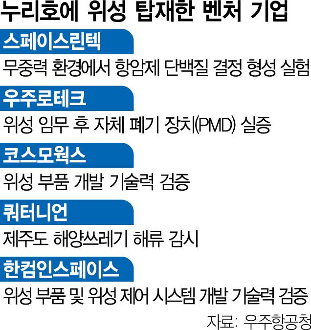 이번 누리호 4차 발사에는 다섯 개 벤처 기업이 개발한 부탑재 위성(큐브위성) 여섯 기가 발사체에 실린다.