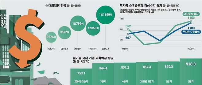 한국은행에 따르면, 올해 3분기 기업의 외화예금 월평균 잔액은 918억8000만달러(약 134조원)로, 역대 최고 수준을 기록했다. 이는 기업들이 상품 수출대금을 달러로 받은 뒤 원화로 환전하지 않고 그대로 보유한 데 따른 것이다.