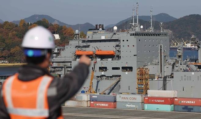 [19일 오후 경남 창원시 마산합포구 마산가포신항에서 미 해군 군수지원함 '월리 쉬라 호'의 MRO 작업이 진행 중이다. (사진=연합뉴스)]