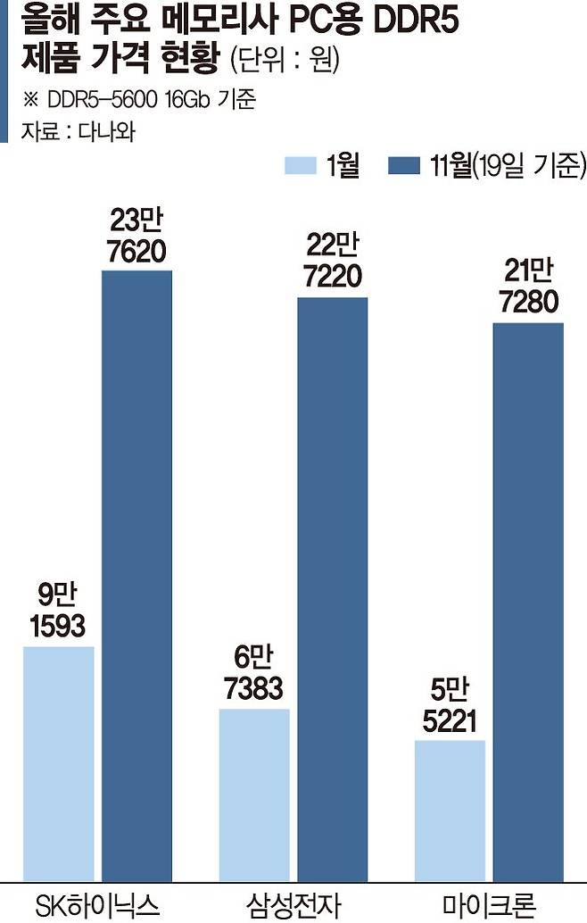 가격비교서비스 다나와 집계에 따르면 조립PC 등에 사용되는 삼성전자의 DDR5-5600 16GB 제품은 올해 1월 평균 6만7383원에 거래됐지만 이날 기준 22만7220원에 거래되고 있다. 가격 상승률은 237%로 1월 대비 3배 이상의 웃돈을 줘야 살 수 있는 셈이다. 다른 제품들도 상황은 비슷하다. 1월 5만5221원의 시세로 거래됐던 마이크론의 DDR5-5600 16GB 제품은 이날 기준 21만7280원으로 4배 가까이(293%) 치솟았고, SK하이닉스의 동일 사양 제품도 같은 기간 9만1593원에서 23만7620원으로 2.5배(159%) 비싸졌다.