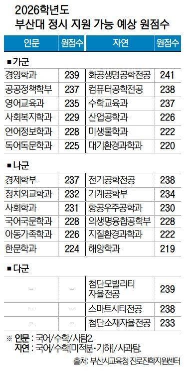 이 같은 성적 흐름에 따라 부산 지역 주요 대학의 정시 지원 가능 점수도 대부분 낮아질 것으로 전망된다. 인문계 부산대 상위권 학과는 지난해보다 약 10점, 하위권은 6~10점 하락할 것으로 분석됐다. 국립부경대는 1~6점, 동아대는 약 3점 낮아질 것으로 보인다. 다만 다군 일부 학과는 경쟁 완화로 약 3점 상승할 가능성도 있다.