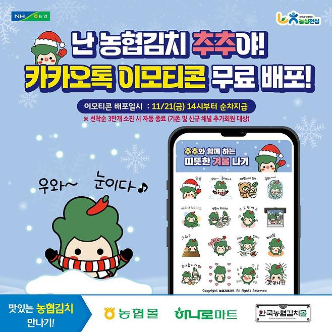 농협경제지주는 21일 오후 2시부터 '한국농협김치' 카카오톡 채널을 친구 추가한 고객 선착순 3만 명에게 이모티콘을 무료 제공할 예정이다.