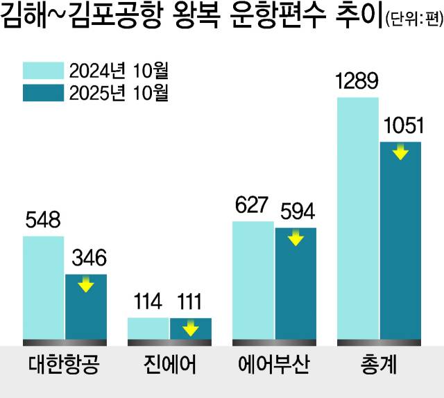 19일 대한항공·에어부산·진에어 등에 따르면 지난달 기준 김해~김포공항 왕복 항공편은 1051편이다. 이는 지난해 10월 김해~김포공항 왕복 항공편(1289편)보다 약 18% 감소한 것이다.