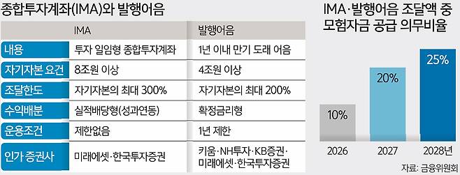 이를 위해 IMA 사업자는 조달한 자금 중 70% 이상을 기업 금융 관련 자산에 투자해야 하고 부동산 운용 한도는 10% 이하로 제한된다. 전체 운용자산 중 IMA·발행어음 조달액의 25%에 해당하는 자금은 중소·벤처기업, 신용등급 A 이하 채무증권, 벤처캐피털(VC) 등 모험자본에 의무적으로 공급해야 한다.