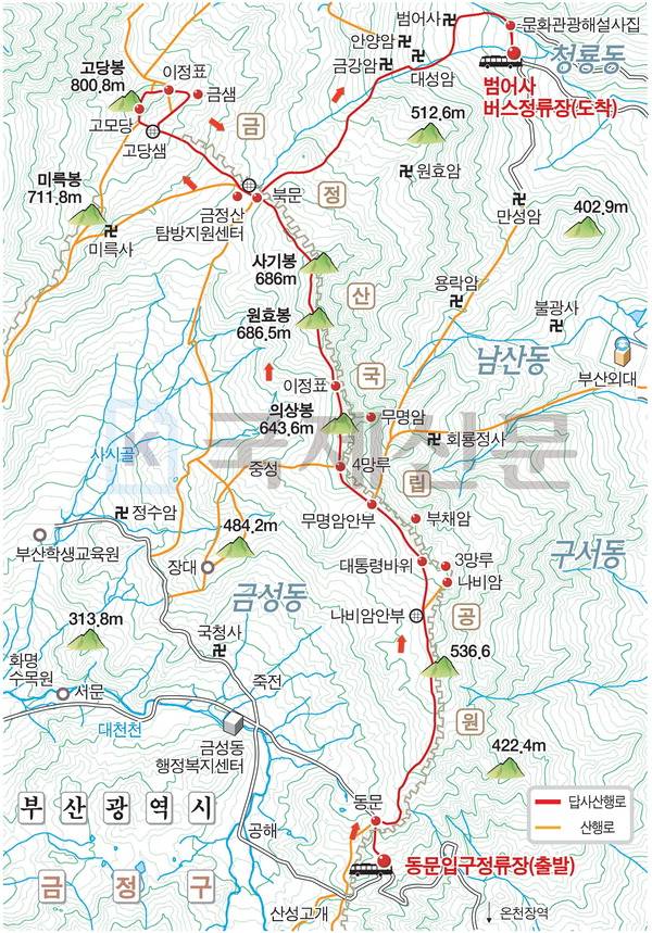 동문~고당봉~범어사 산행 경로는 다음과 같다. 동문입구버스정류장~동문~나비암 안부 샘터~대통령 바위~무명암 안부~4망루~원효봉 정상~북문~금정산 탐방지원센터(세심정)~고당샘~고모당(전망 덱)~고당봉~철계단~금샘 갈림길~고당샘~북문~마당바위~금강암 갈림길~대성은수(암괴)~범어사를 거쳐 범어사버스정류장에서 마친다. 산행거리는 약 9㎞이며 5시간 안팎 걸린다.