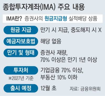 개인투자자 입장에서 IMA의 가장 큰 장점은 예금처럼 원금이 사실상 보장되면서도 예금보다 높은 수익률을 노려볼 수 있다는 점이다. IMA엔 예금자보호법이 적용되지 않아 예금처럼 원금이 온전히 보장된다고 할 순 없지만 증권사가 파산하는 등 극단적 경우가 아니라면 원금을 지급받을 수 있다. 수익률과 상품의 종류는 증권사 재량이지만 증권가 안팎에선 예금과의 차별화를 위해 목표 수익률이 5~8%인 ‘중위험·중수익’ 이상의 상품이 주로 출시될 것으로 예상한다. 개인투자자가 접근하기 어려운 인수금융, 프리 IPO(상장 전 지분 투자) 등 다양한 자산군에 분산투자할 수 있다는 것도 장점으로 꼽힌다.