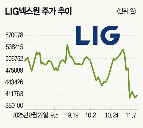 LIG넥스원 주가는 11월 7일 하루 만에 17.15% 급락했다. 40만원 선이 무너지며 주가는 한때 39만원까지 내려갔다. 11월 중순 현재 주가는 40만원 초반대에 머무르고 있다.