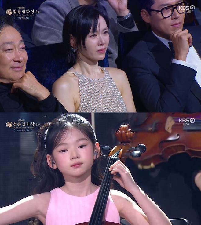이날 축하공연으로 영화 '어쩔수가없다'에서 주인공 만수(이병헌)·미리(손예진)의 딸 리원으로 출연한 최소율 양이 첼로를 연주했다.