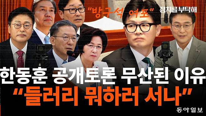 ▷ 조동주: 알겠습니다 이제 오프닝 토크 간단히 해봤고 이제 또 본격적인 주제로 넘어갈게요. 이게 요즘 뭐 이제 장안의 화제 한동훈 전 법무부 장관과 전 민주당 출신 법무부 장관들의 토론 성사 여부 이제 이게 엄청난 화제입니다. 그래서 이제 한동훈 전 이 대표가 정성호 현 법무부 장관, 추미애 전 법무부 장관 그리고 조국 전 법무부 장관 그리고 박범계 전 법무부 장관 이렇게 민주당 출신 법무부 장관 인사들한테 줄줄이 이제 대장동 항소 포기에 대해서 공개 토론을 하자 이렇게 주장을 하고 있어요. 그런데 이제 뭐 대부분 이제 거절이 돼서 성사가 안 됐고 제가 이분들 중 한 분한테 이제 왜 안 하시냐 한번 물어봤어요. 그러니까 이제 보니까 이제 한동훈 전 대표가 국민의힘에서 입지가 없으니까 자기가 좀 소위 말하면 좀 떠보려고 이렇게 애를 쓰는 것 같은데 그걸 굳이 받아줄 이유가 있냐 뭐 이런 식으로 얘기를 하시더라고요. 그런데 이제 뭐 박범계 의원 같은 경우는 이제 공개 발언에서 한동훈 전 대표가 깐족거리는 태도를 좀 바꿨으면 한다 뭐 이러면서 조건부 승낙을 하는 것 같은 뉘앙스의 말을 해서 한동훈 전 대표가 뭐 역시 추미애 조국과는 박범계는 다르다 하면서 이제 공손하게 답할 테니까 이제 시간과 장소만 정해 달라 뭐 이제 이렇게 얘기를 했거든요. 그래서 이제 저희 기자들도 이게 사실 성사가 되면 서로 저희 채널부터도 엄청나게 모셔오고 싶은 두 분인데 이렇게 성사가 되나 했더니 이제 박범계 의원 전 장관 지금 의원이죠. 의원이 이제 태도를 얘기했더니 공손하게 하라고 했다고 읽는다. 한계를 못 벗어난다 뭐 이런 페북글을 남겼고 그러니까 이제 한동훈 대표가 거기 또 이제 그 댓글을 달았어요. 그래서 토론을 하겠다는 거냐 말겠다는 거냐 뭐 이제 이렇게 댓글을 달고 이제 그 SNS 얘기는 없는데 뭐 이제 지금 분위기에서는 토론이 성사되기가 쉽지 않아 보이기도 하는데 이제 한동훈 전 대표는 이제 거대 여당 법무부 장관들이 이 방구석 여포처럼 이게 뭐냐 뭐 이렇게 계속 비판을 하고 있습니다. 그래서 이렇게 한동훈 전 장관이 이제 대장동 관련해서 공개 토론을 촉구를 하고 뭐 이제 이러면서 이제 언론의 주목을 받으니까 이제 보수논객 조갑제 대표는 이제 페이스북 보니까 한동훈의 별의 순간이 왔다. 그것도 계엄 1주년을 앞두고. 뭐 이제 이렇게 표현을 하셨더라고요. 그래서 언론에 좀 원외에 그리고 지금 의원도 아니고 뭐 이제 공직에 있지도 않은 한동훈 전 대표가 이렇게 언론의 관심을 받는 건 참 이례적인 순간인 것 같긴 해요. 이제 이 토론을 이제 왜 안 받는 걸까요? 민주당 출신 법무부 장관들이?