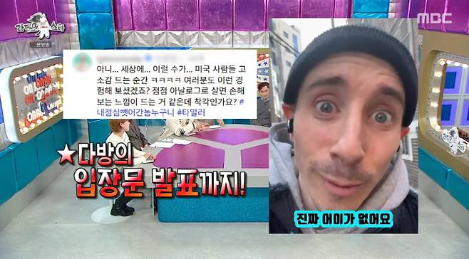 그는 "미국에서는 바이럴 마케팅을 많이 한다. 이슈가 있을 때 그 사람을 위한 샌드위치를 출시한다"면서 "조회수 100만이 넘고 브랜드 이름이 노출되는데 회사에서는 바이럴 된 김에 '타일러 샌드위치를 내자'고 한다"며 미국의 흔한 마케팅 방법에 설명했다. 그러면서 타이러는 "그래서 연락 기다리고 있다. 연락 달라"고 했고, 김구라는 "무서운 친구다"고 해 웃음을 안겼다.