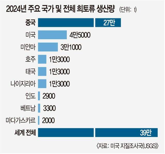 희토류가 미·중 관계의 핵심 뇌관으로 꼽히는 배경엔 중국의 압도적인 희토류 점유율이 있다. 미국 지질조사국(USGS)이 공개한 ‘2025 광물자원 시장동향 보고서’에 따르면 지난해 글로벌 희토류 생산량 39만t 중 중국 생산량은 27만t으로 전체의 약 70%를 차지한다. 2023년(24만t)에 이은 1위다.