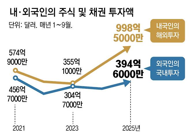 문제는 해외에 투자를 많이 해서 원-달러 환율이 높아지고, 그로 인해 달러 쇼핑을 늘리는 악순환이 나타날 수 있다는 것이다. 주원 현대경제연구원 연구본부장은 “한국 증시가 미국 증시의 영향을 너무 많이 받다 보니 2030세대들이 차라리 미국에 직접 투자하자는 경향이 강해졌다”며 “원화 약세가 심화하면 고환율에 대비해 달러를 추가 확보하려는 가수요가 더 늘며 한국 경제에 부담으로 작용할 것”이라고 내다봤다. 조병현 다올투자증권 투자전략팀장은 “결국 한국 자산에 대한 투자 매력도가 개선돼야 한다”며 미국 관세 폭풍 속에 해외 투자가 더욱 늘어나면 “상대적으로 내부 펀더멘털(기초체력)이나 경제 동력이 약해질 수 있다”고 우려했다.