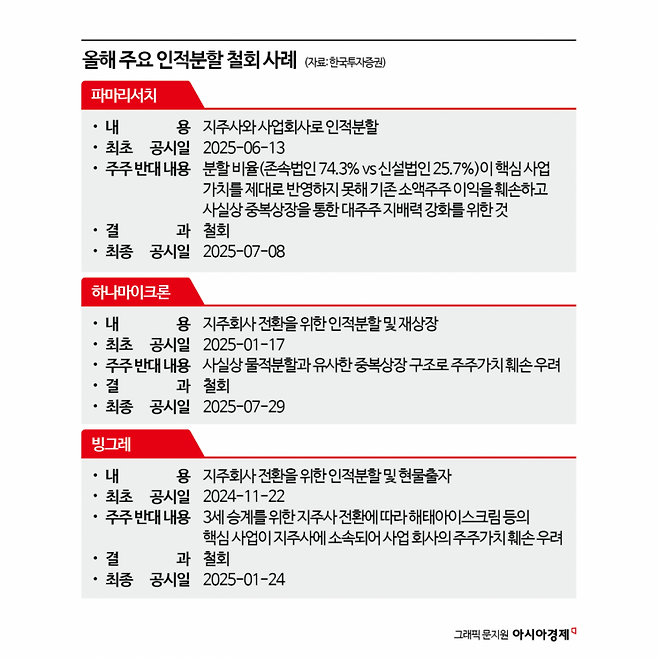 다만 최근 상법 개정 흐름이 이어지면서, 중복상장 시도는 한풀 꺾인 모양새입니다. 정부와 여당은 올해 두 차례의 상법 개정을 통해 이사의 충실의무 대상 확대(회사→회사 및 주주), 집중투표제 도입 등 변화를 이끌어냈는데요. 이후 일부 기업들이 소액주주 반발에 부딪혀 기업 분할 계획을 철회했습니다. 파마리서치는 지주사 전환을 위한 인적분할을 철회했고, 하나마이크론과 빙그레도 같은 이유로 분할 계획을 접었습니다.