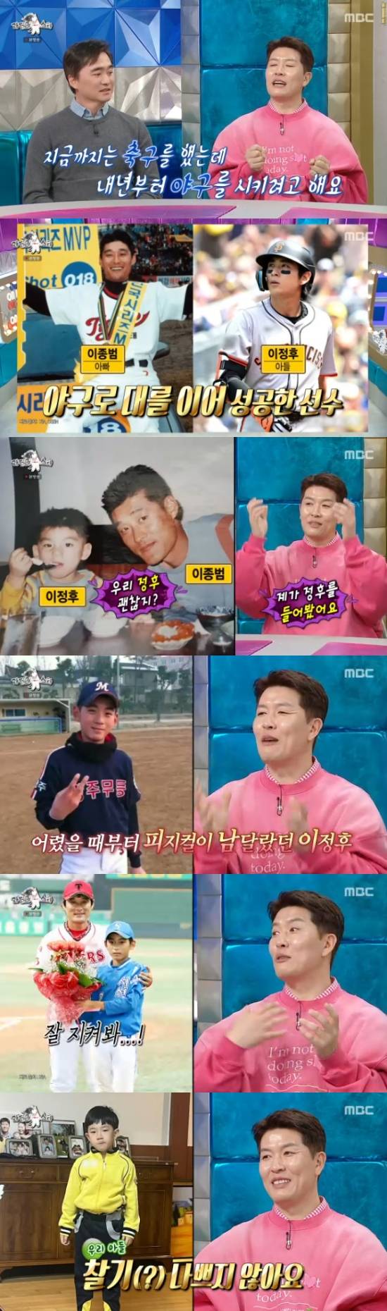 김병현은 "정후가 4살 쯤 처음 봤었다. 안아봤더니 피지컬이 남달랐다. 밸런스가 너무 좋았다. 이종범 선배한테 '야구를 무조건 시켜야겠다'고 했었고, 이종범 선배도 '잘 봐라'고 했는데, 그 아이가 커서 이정후 선수가 된거다. 뿌듯하다. 그런데 우리 아들 피지컬도 나쁘지 않다"고 덧붙이며 미소를 감추지 못했다.