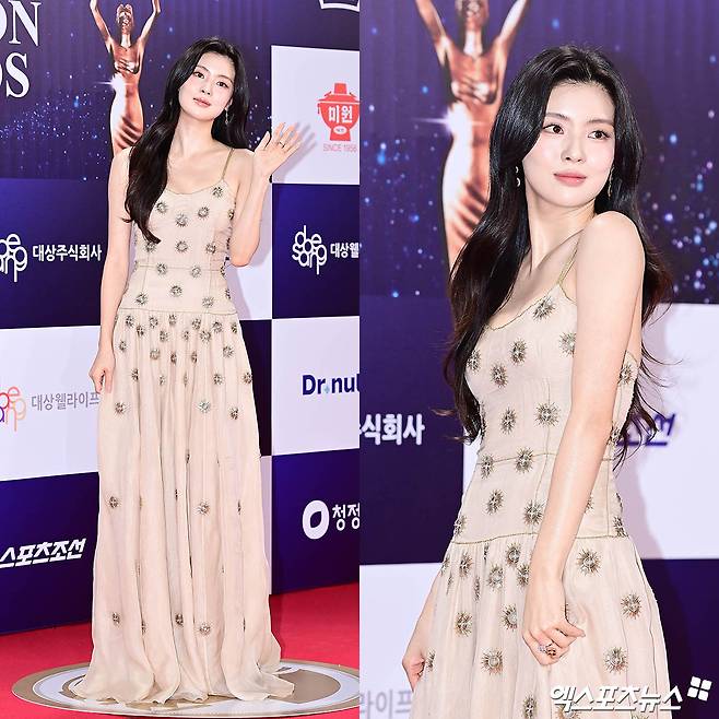 이날 이선빈은 누드톤의 롱 드레스를 선택해 차분하면서도 고급스러운 분위기를 뽐냈다. 얇은 스트랩과 단정한 실루엣이 가녀린 매력을 돋보이게 만들었다. 어깨 라인을 시원하게 드러내면서도 청초한 느낌을 주는 한편, 절제된 디자인이 로맨틱한 무드를 연출했다.
