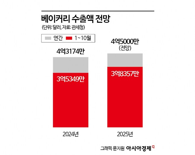 19일 관세청에 따르면 올해 1~10월 빵·과자 등 베이커리 수출액은 3억8357만달러로 전년 동기(3억5349만달러) 대비 8.5% 증가했다. 지난해 연간 수출액은 4억3174만달러로 역대 최고치를 기록했는데, 올해도 무난히 새 기록을 쓸 것으로 전망된다.