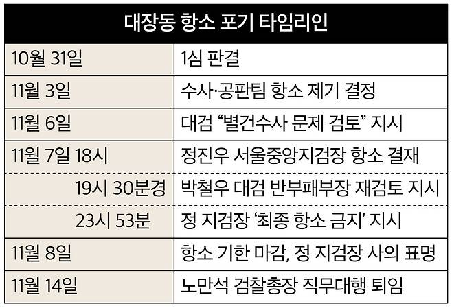 항소 시한이 임박한 7일 오후 7시 30분경 박철우 당시 대검 반부패부장이 재검토 지시를 내리면서 분위기는 급변했다. 오후 11시 20분경 공판 담당 검사들이 4차장실로 찾아가 "항소해야 하니 결단해 달라"고 뜻을 전달했으나, 이준호 4차장검사는 "대검에서 불허했고, 검사장도 불허했다. 어쩔 수 없다"고 전했다. 그 시각 법원에서는 항소장을 접수하기 위해 직원들이 대기하고 있었다. 결국 항소 기한 마감 7분 전인 오후 11시 53분 정 지검장이 '최종 항소 금지' 지시를 내렸다. 정 지검장은 다음 날 오전 사의를 표명했고, 11월 19일 박철우 대검 반부패부장이 후임자로 임명됐다.