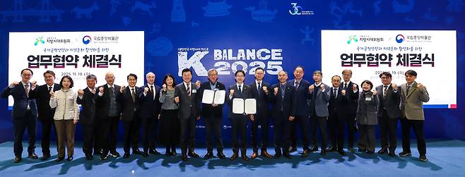 | ▲ 김경수 지방시대위원장과 유홍준 국립중앙박물관장은 11월 19일(수), 2025 대한민국 지방시대 엑스포가 열리고 있는 울산전시컨벤션센터에서 국가균형성장과 지역문화 활성화를 위한 업무협약(MOU)을 체결하고 참석자와 함께 기념사진을 촬영했다. |