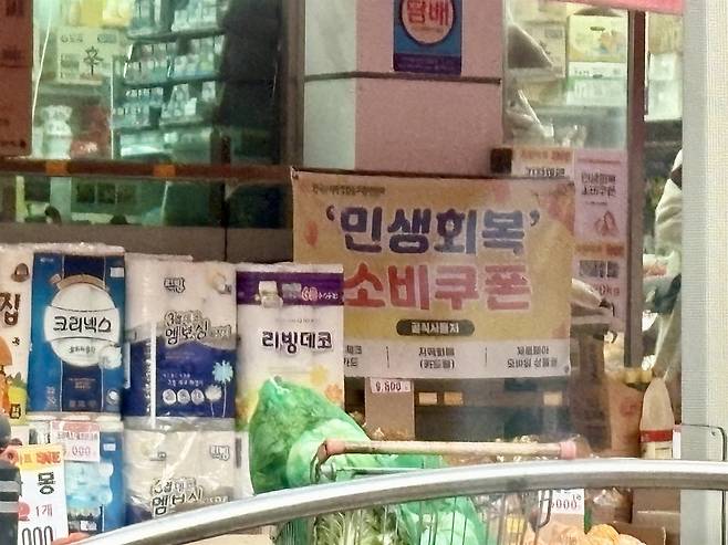 | ▲ 민생소비쿠폰 사용이 가능하다는 표지가 붙은 동네의 한 수퍼 |