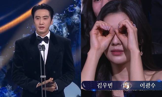 이광수가 무대에 오르는 타이밍에 맞춰 카메라는 객석에 있는 이광수의 연인 이선빈의 모습을 잡았다.