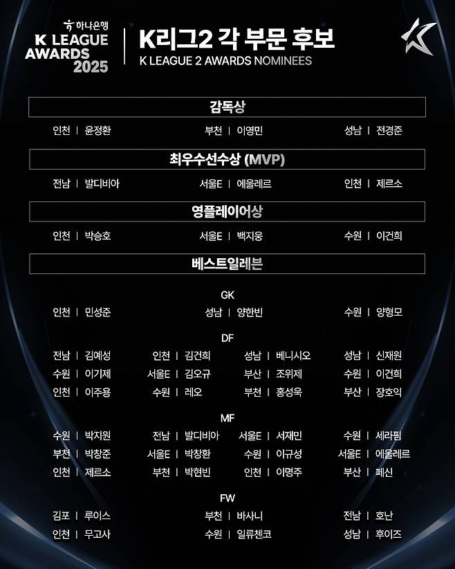 MVP·영플레이어·감독상 수상자는 같은 날 오후 3시 서울 홍은동 스위스그랜드호텔에서 열리는 '하나은행 K리그 2025 대상 시상식' 현장에서 발표된다.