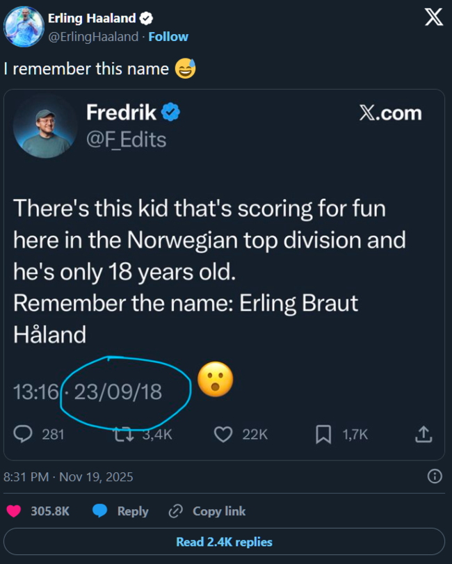 7년이 지나고 홀란드는 그 팬을 잊지 않고 기억했다. 홀란드는 20일(한국시간) 개인 SNS를 통해 7년 전 프레드릭의 게시물을 공유한 다음 “이 이름을 기억한다”라는 짧은 문구를 남겼다. 유망주에 불과했던 자신의 성공을 예측하고, 이름을 알리려고 노력한 프레드릭에 대한 일종의 ‘감사 인사’였다.
