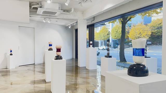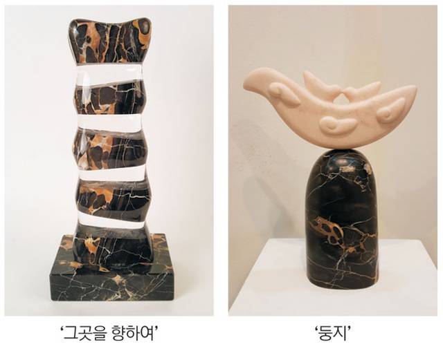 클래식 음악이 흐르는 전시장(위)에서 작은 탑(塔)을 떠올리게 하는 작품들이 우선 눈에 띈다. ‘그곳을 향하여’라는 제목을 지닌 연작들이다. 돌과 유리층을 여러 층 이어붙여 독특한 조형미를 만들어냈다. 기하학적 구조와 패턴이 대비감과 통일감을 함께 주며 묘한 아우라를 뿜는다. 같은 작품도 보는 각도에 따라 다른 느낌을 준다.