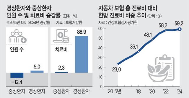 경상환자의 치료비 급증에 한방병원도 한몫하고 있다. 건강보험심사평가원에 따르면 자동차보험 한방병원 치료비는 지난해 1조 원이 넘었다. 특히 자동차보험 보험금 중 한방진료비가 차지하는 비중은 지난 2015년 23%에서 점차 늘어나 지난 2021년 양방 진료비를 추월한 54.6%를 기록한 뒤 지난해 59.2%로 급증해 왔다. 한방병원은 교통사고 경상환자가 내원하면 침·구(뜸)·부항·약침술·한방수기요법(추나요법 등)·한방전기요법·첩약 등 이른바 ‘7종 세트’를 한꺼번에 다중 진료하는 경우가 빈번하다. ‘세트 청구’를 하다 보니 경상환자 1인당 한방 치료비는 평균 102만 원으로 양방 치료비 33만 원의 3배가 넘는다.