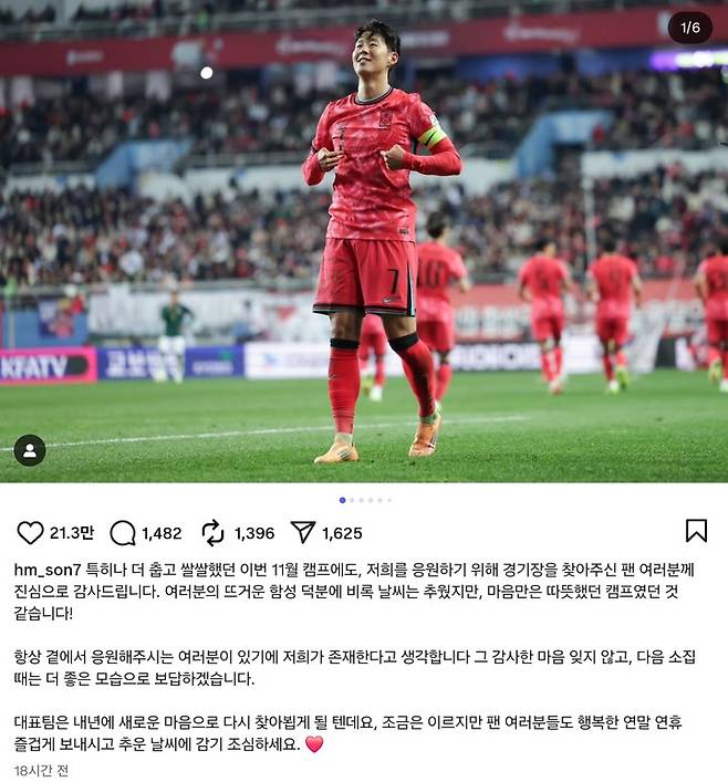 손흥민은 지난 19일 자신의 SNS를 통해 "특히나 더 춥고 쌀쌀했던 이번 11월 캠프에도, 저희를 응원하기 위해 찾아주신 팬 여러분께 진심으로 감사드린다"며 "여러분의 뜨거운 함성 덕분에 비록 날씨는 추웠지만 마음만은 따뜻했던 캠프였던 것 같다"는 인사를 전했다.